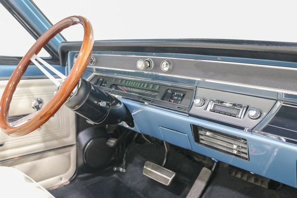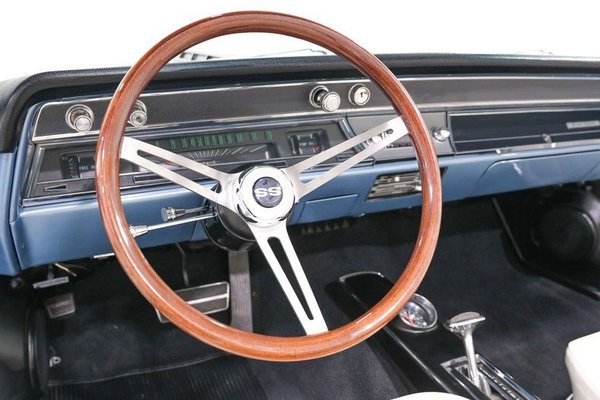 This SS does more than look the part. Four wheel disc brakes provide confident stopping power, while B G Rod Works wheels plant it firmly in the present with a muscular stance. The console shifter and center console with clock anchor the white vinyl bucket seat interior, giving the cockpit that unmistakable Super Sport feel.