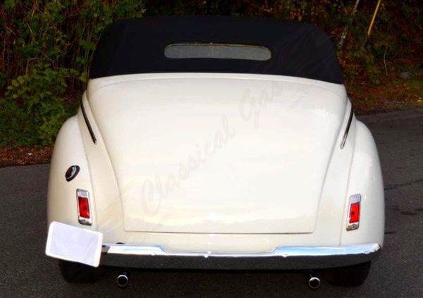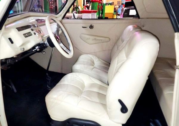 This classic custom is a testament to timeless style. The look of a 4" Chopped Windshield with a black Carson removable top gives the best of both worlds. The Hartz black cloth is one of the finest available. This classic custom mercury combines the elegance of the rolling front fenders and streamlined nacelle headlights. Gleaming three-piece set chrome grille makes for its distinct and luxury features. The door handles have been shaved and removed for a clean custom appearance. Open the doors with Dakota digital door poppers. A remote power windows can be operated by a fob. The gleaming white paint with black Carson top and chrome finished trim makes the 40 Mercury a showstopper.