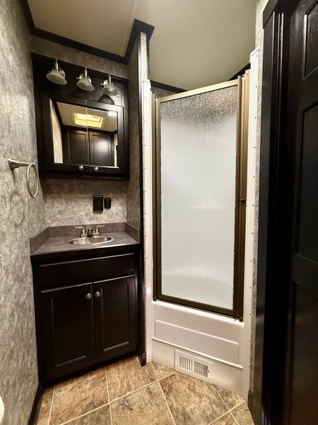 20' full living quarters 28' garage 12' standing height living 8' loft bed area.